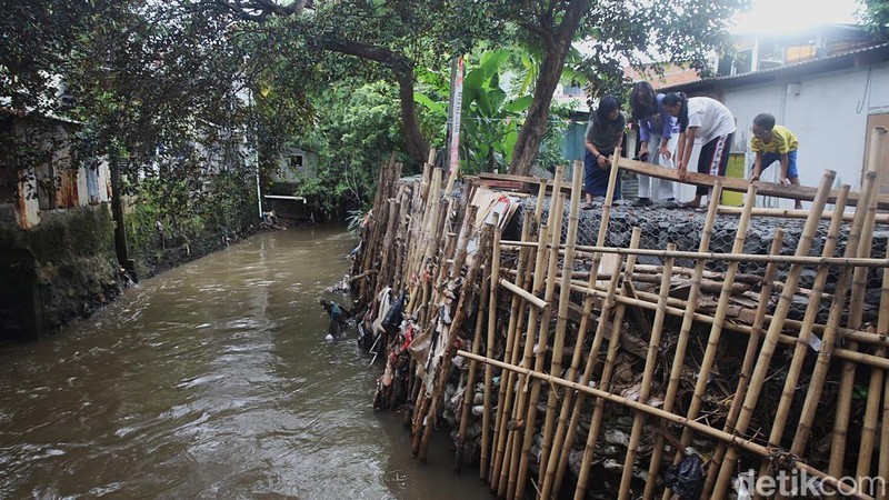 Warga beraktivitas di samping tanggul Kali Krukut di Petogogan, Jakarta, Rabu (12/11/2025).