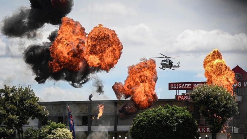 Tak hanya upacara resmi, perayaan ini juga diwarnai demonstrasi kemampuan tempur yang memukau. Helikopter Korps Marinir melakukan manuver udara presisi, memperlihatkan kesiapan dan profesionalisme prajurit dalam berbagai skenario operasi. Atraksi ini menjadi salah satu bagian yang paling menarik perhatian tamu undangan dan masyarakat yang hadir. ANTARA FOTO/Sulthony Hasanuddin