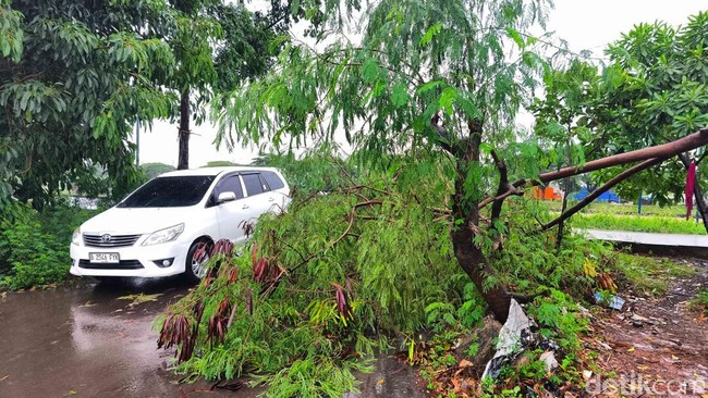 Hujan Angin Robohkan Pohon di Harapan Indah, Pengendara Lewati Celah Sempit