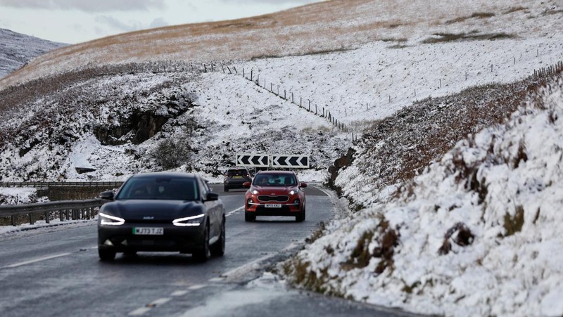 Mobil-mobil melaju di tengah salju di dekat Penistone, saat suhu beku melanda Inggris Utara selama musim dingin, Inggris. Lapisan putih ini menandai turunnya salju pertama musim dingin. Foto: REUTERS/Temilade Adelaja