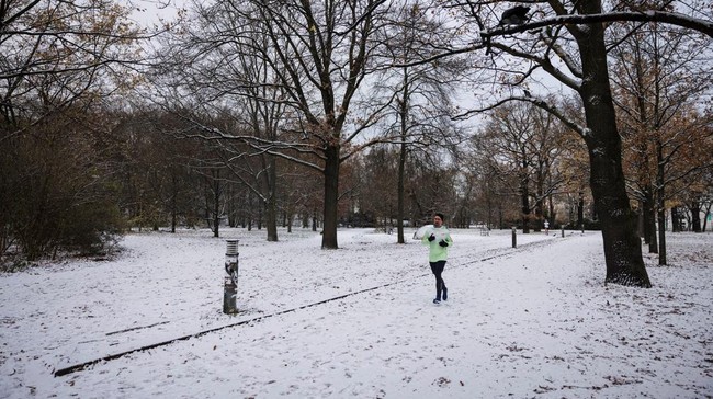 Seseorang berjalan di Volkspark Friedrichshain, setelah hujan salju melanda ibu kota Jerman, Berlin, Senin (24/11/2025). REUTERS/Annegret Hilse