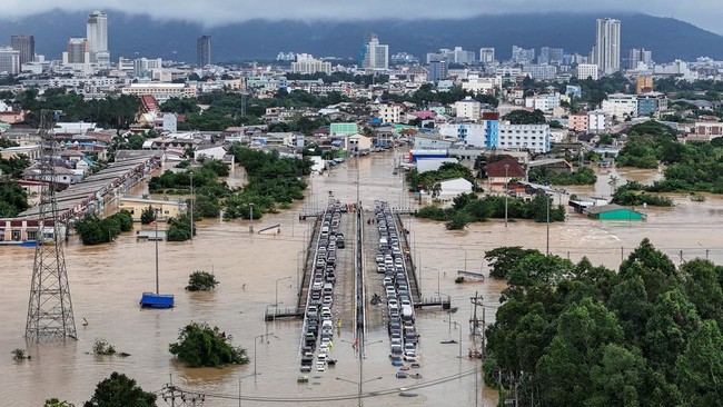 Foto udara menunjukkan mobil-mobil terparkir di sebuah jembatan untuk menghindari air banjir di distrik Hat Yai, yang terdampak hujan lebat yang melanda 10 provinsi di Thailand Selatan dan menewaskan beberapa orang, di provinsi Songkhla, Thailand (25/11/2025). REUTERS/SITHICHAI CHOOTOCHANA