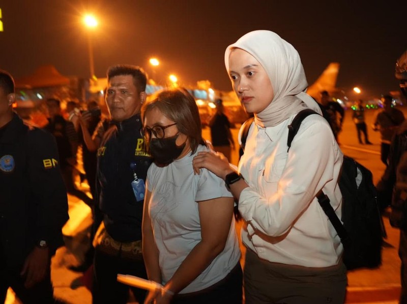 Foto: Dewi Astutik tiba di Indonesia pada Selasa (2/12) malam usai ditangkap di Kamboja pada Senin (1/12). Tangan Dewi tampak terikat kabel ties saat mendarat di Tanah Air (Dok.istimewa)