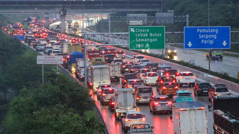 Barisan kendaraan tampak merayap, terutama di jalur utama yang mengarah ke Depok.