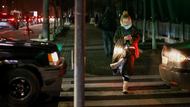 Lampu lalu lintas padam, membuat warga menyeberang dengan hati-hati di antara kendaraan yang merayap di jalan gelap Kyiv saat pemadaman berlangsung. REUTERS/Thomas Peter
