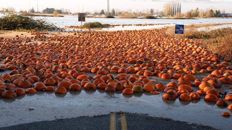 Di wilayah Snohomish, genangan air tampak menutupi area sekitar sungai. Benda-benda yang terbawa arus, termasuk labu-labu dari ladang sekitar, terlihat mengapung di dekat jalan yang ditutup demi keselamatan warga. Kondisi ini menjadi gambaran dampak banjir yang meluas akibat intensitas hujan yang tak kunjung reda. REUTERS/David Ryder