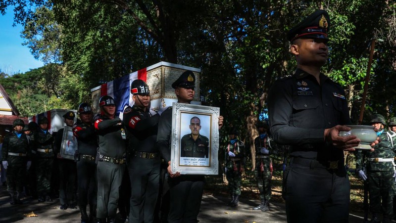 Empat prajurit yang gugur dalam insiden tersebut yakni Sersan Mayor Kelas Satu Taweerat Rattanaburi, Sersan Mayor Kelas Satu Damrongkiat Kaewkrachang, Prajurit Mustageem Chema, dan Prajurit Kritdikorn Sroiraya. REUTERS/Athit Perawongmetha