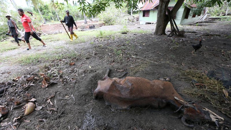 Warga melihat ternak yang mati pascabanjir bandang di Desa Alue Kuta, Kecamatan Jangka, Bireuen, Aceh, Minggu (14/12/2025). Data posko tanggap darurat mencatat 40.328 hektare tambak, 65.105 hektare sawah, dan 14.741 hektare kebun rusak di 18 kabupaten/kota akibat bencana pada 26 November 2025. FOTO/Irwansyah Putra
