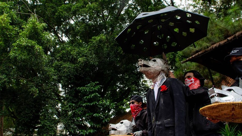 Aksi tersebut diwujudkan dalam pertunjukan seni rupa dan teatrikal sebagai bentuk kritik publik terhadap maraknya praktik korupsi dan eksploitasi alam di Indonesia. ANTARA FOTO/Novrian Arbi