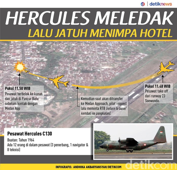 Jakarta - Pesawat Hercules C130 jatuh menimpa bangunan hotel dan mobil di Medan, Sumatera Utara. Pesawat tersebut sempat meledak lalu menimpa hotel Braspati.