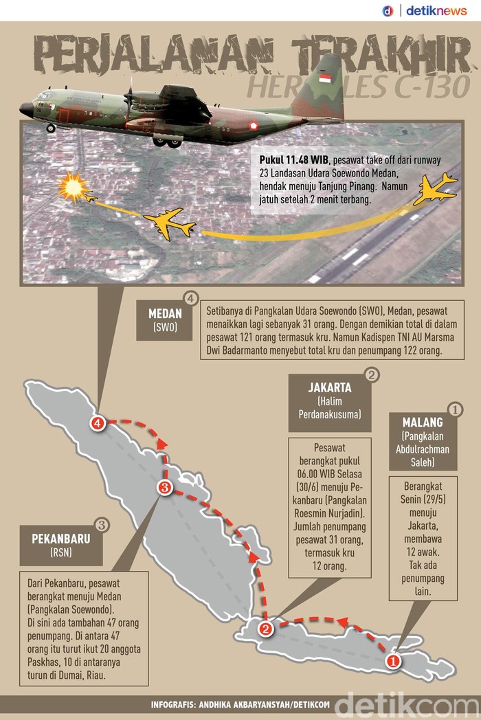 Jakarta - Hercules C-130 yang selama ini menjadi andalan TNI dalam misi-misi militer maupun kemanusiaan jatuh di Medan, Sumatera Utara. Begini perjalanan terakhir si 'perkasa' sebelum meledak dan menghantam bangunan.