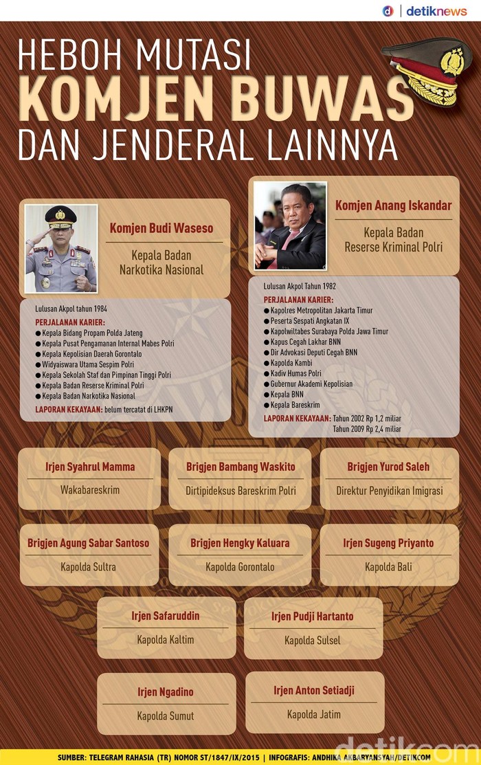Jakarta - Kabareskrim Komjen Budi Waseso dipastikan bertukar posisi dengan Kepala Badan Narkotika Nasional (BNN) Komjen Anang Iskandar. Bagaimana profil mereka dan siapa saja jenderal yang dimutasi lainnya?