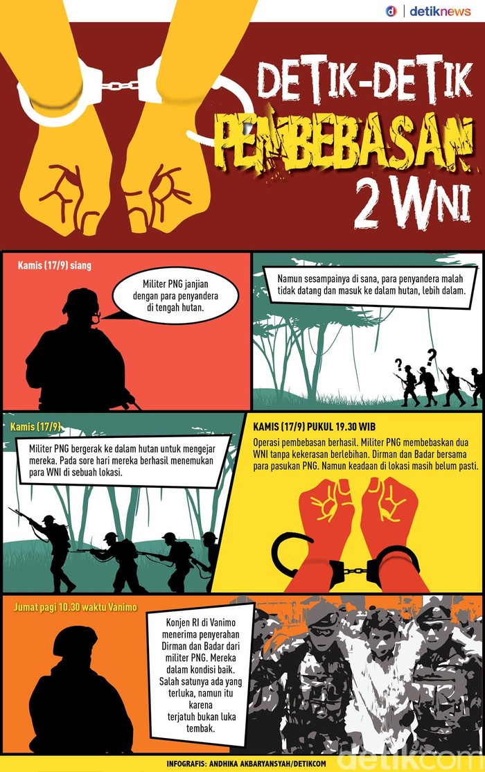 Jakarta - Dua WNI Sudirman dan Badar berhasil diselamatkan oleh militer Papua Nugini. Mereka dalam kondisi baik, walaupun ada yang terluka karena terjatuh. Bagaimana operasi tersebut berjalan?
