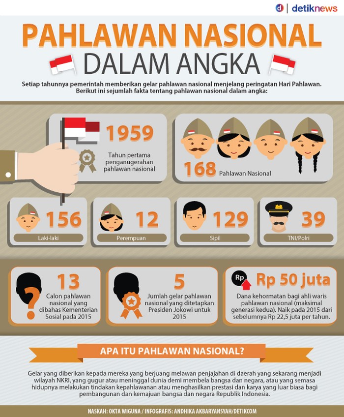 Jakarta - Setiap tahunnya pemerintah memberikan gelar pahlawan nasional menjelang peringatan Hari Pahlawan. Berikut ini sejumlah fakta tentang pahlawan nasional dalam angka.