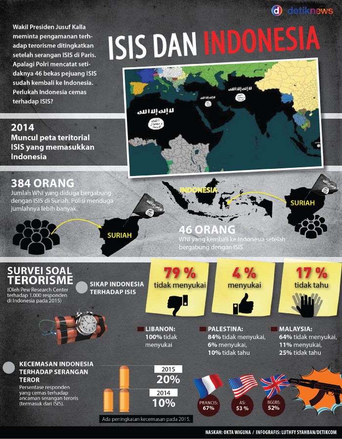 Jakarta - Wakil Presiden Jusuf Kalla meminta pengamanan terhadap terorisme ditingkatkan setelah serangan ISIS di Paris. Apalagi Polri mencatat setidaknya 46 bekas pejuang ISIS sudah kembali ke Indonesia. Perlukah Indonesia cemas terhadap ISIS?