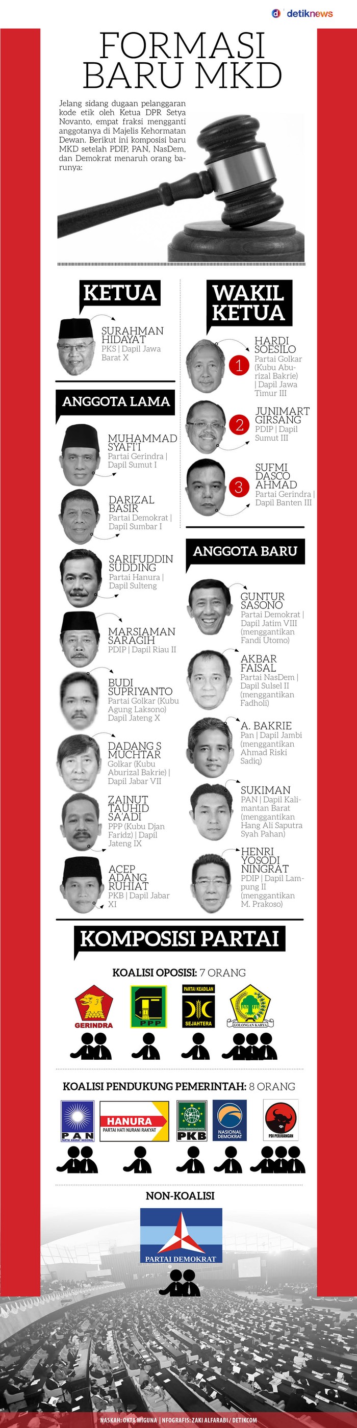 Jakarta - Jelang sidang dugaan pelanggaran kode etik oleh Ketua DPR Setya Novanto, empat fraksi mengganti anggotanya di Majelis Kehormatan Dewan. Berikut ini komposisi baru MKD setelah PDIP, PAN, NasDem, dan Demokrat menaruh orang barunya.
