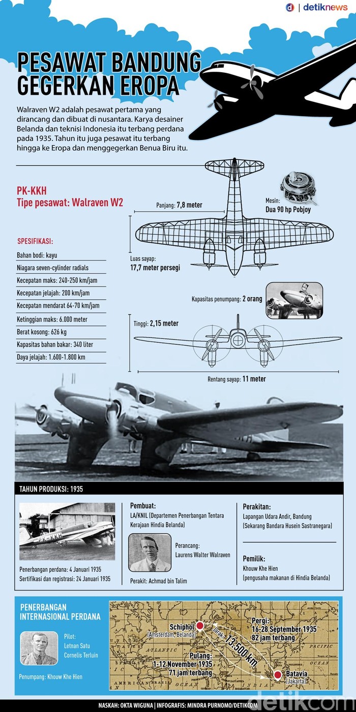 Jakarta - Walraven W2 adalah pesawat pertama yang dirancang dan dibuat di nusantara. Karya desainer Belanda dan teknisi Indonesia itu terbang perdana pada 1935. Tahun itu juga pesawat terbang hingga ke Eropa dan menggegerkan Benua Biru itu.