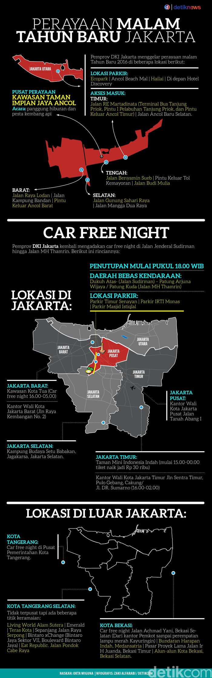 Jakarta - Untuk menyemarakan pesta pergantian tahun malam nanti, Pemprov DKI menggelar acara di beberapa titik di Jakarta. Selain itu ada juga malam bebas kendaraan (car free night) di jalur protokol Sudirman-Thamrin.
