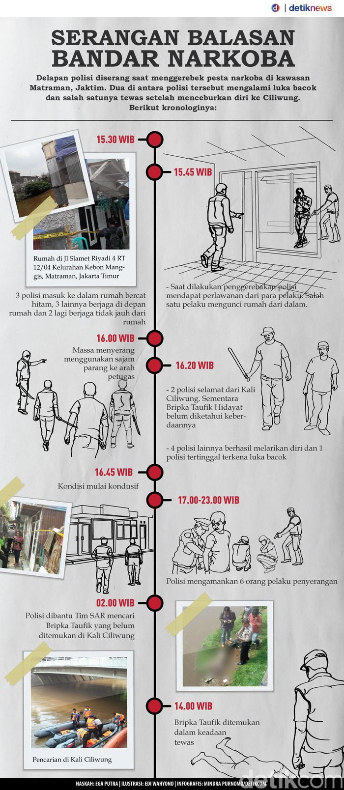 Jakarta - Bripka Taufik Hidayat ditemukan tewas usai menceburkan diri ke Kali Ciliwung setelah diserang bandar narkoba dan kawanannya di Matraman, Jaktim. Berikut kronologinya.