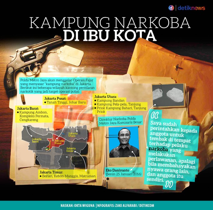 Jakarta - Polda Metro Jaya akan menggelar Operasi Fajar yang menyasar "kampung narkoba" di Jakarta. Berikut ini beberapa wilayah kantong peredaran narkotik yang jadi target operasi polisi: