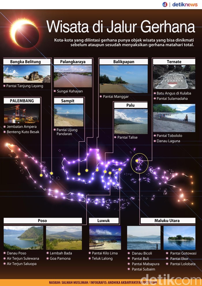 Kota-kota yang dilintasi gerhana punya objek wisata yang bisa dinikmati sebelum ataupun sesudah menyaksikan gerhana matahari total. Berikut daftarnya!