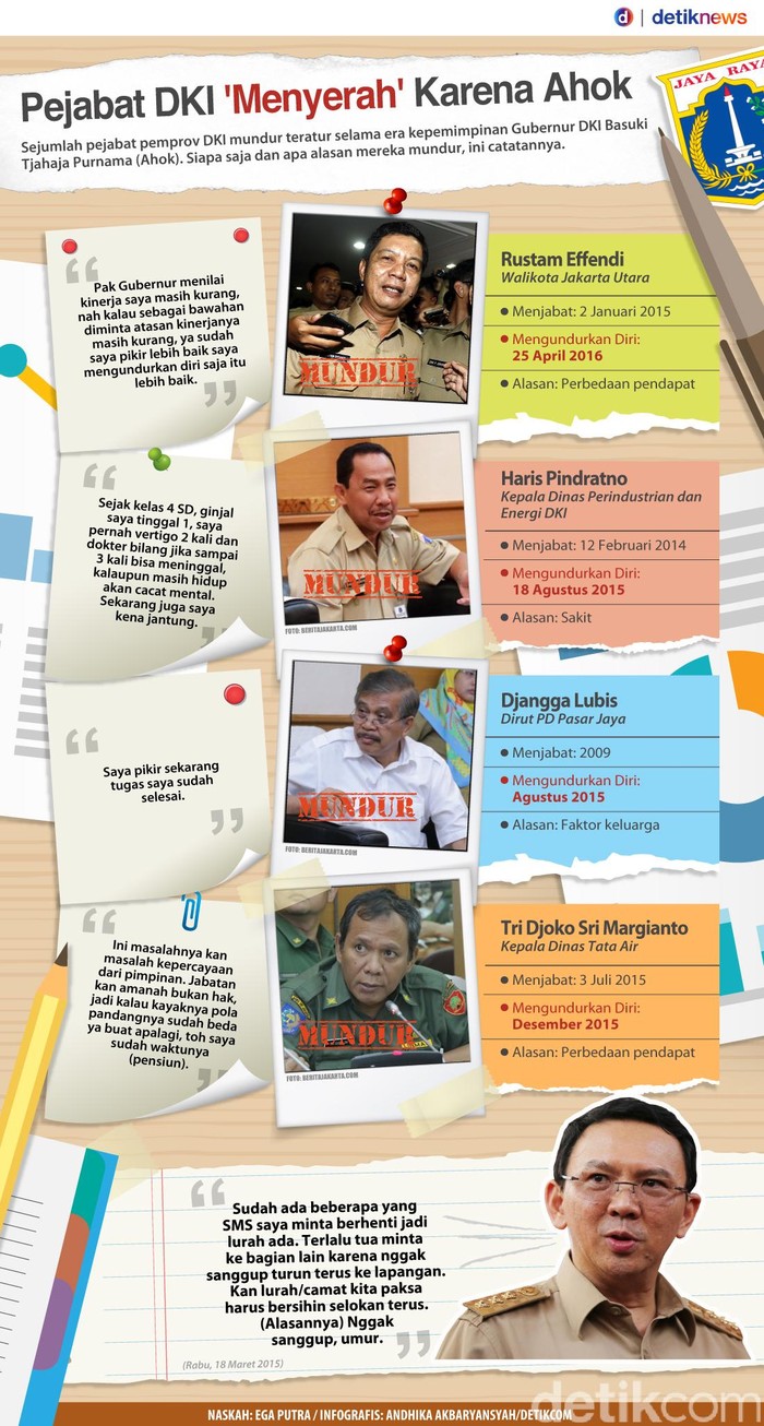 Jakarta - Sejumlah pejabat pemprov DKI mundur teratur selama era kepemimpinan Gubernur DKI Basuki Tjahaja Purnama (Ahok). Siapa saja dan apa alasan mereka mundur, ini catatannya.
