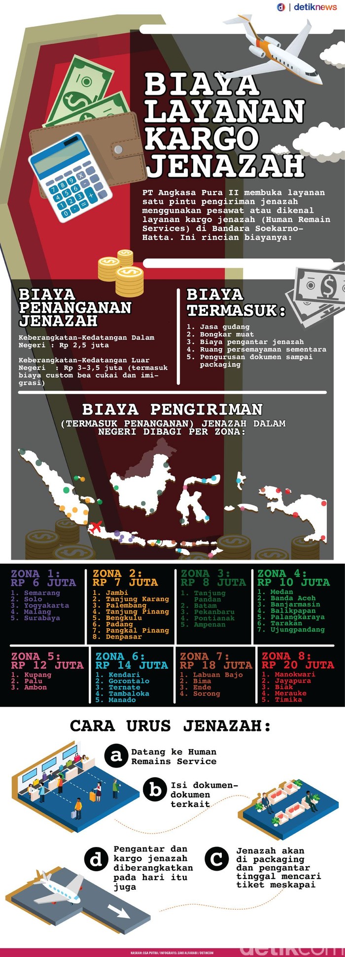 Infografis Biaya Layanan Kargo Jenazah Mega Putra Ratya - detikNews Jumat, 29 Apr 2016 10:25 WIB Foto: Ilustrasi oleh Zaki Alfarabi Jakarta - PT Angkasa Pura II membuka layanan satu pintu pengiriman jenazah menggunakan pesawat atau dikenal layanan kargo jenazah (Human Remain Services) di Bandara Soekarno-Hatta. Ini rincian biayanya: (ega/mad) Infografis Lainnya Infografis Masih Liburan? Cek Lokasi Serambi MyPertamina di Rest Area hingga Bandara Infografis Pariwisata RI Catat Kinerja Solid di 2025, Devisa Capai US$ 13,82 Adhyaksa Awards 2025 Ini 6 Orang Sosok Jaksa Teladan Penerima Adhyaksa Awards 2025