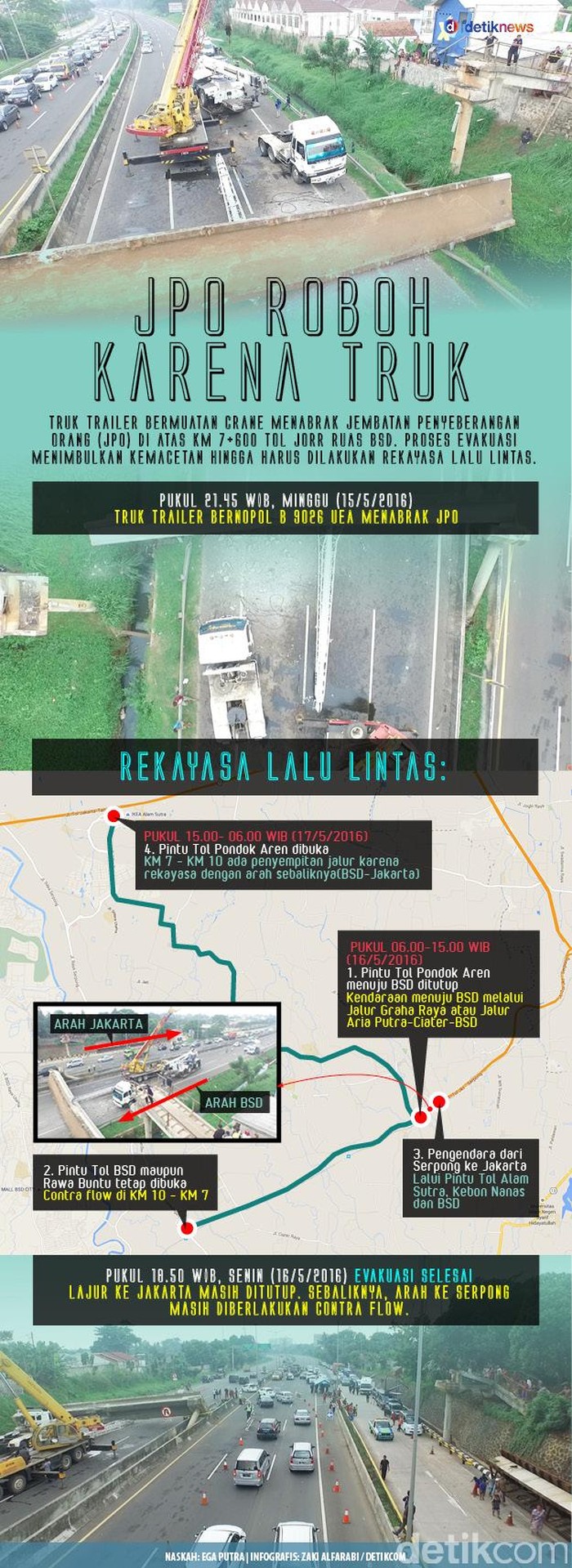 Jakarta - Truk trailer bermuatan crane menabrak JPO di atas KM 7+600 Tol JORR ruas BSD. Proses evakuasi menimbulkan kemacetan hingga harus dilakukan rekayasa lalu lintas.