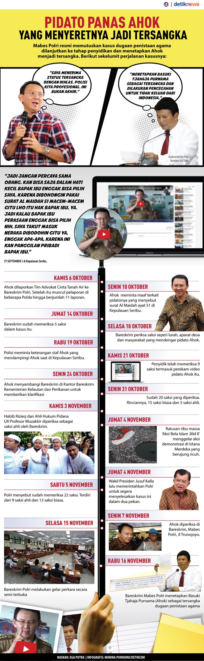 Jakarta - Mabes Polri resmi memutuskan kasus dugaan penistaan agama dilanjutkan ke tahap penyidikan dan menetapkan Ahok menjadi tersangka. Berikut sekelumit perjalanan kasusnya: