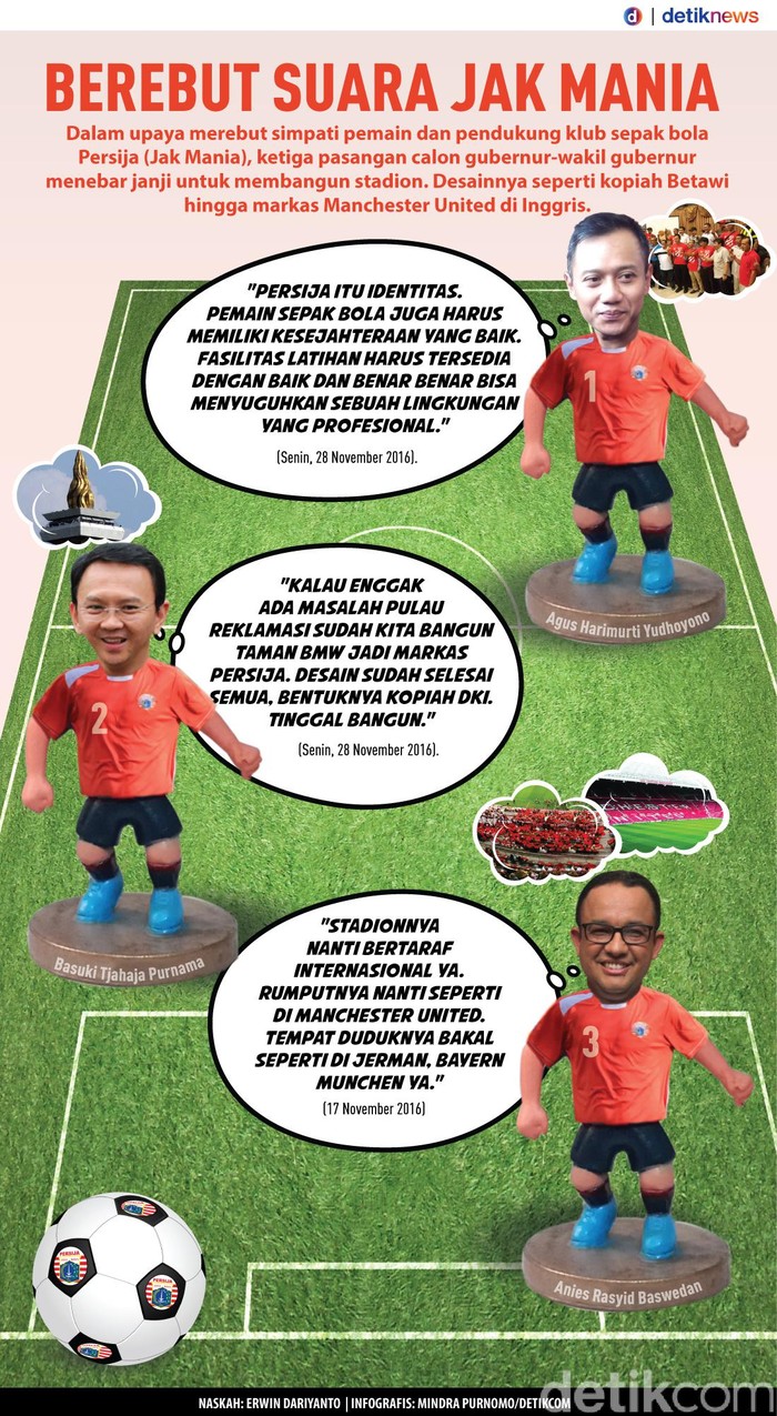 Jakarta - Tiga pasangan calon gubernur dan wakil gubernur menebar janji untuk membangun stadion Persija. Mereka berebut suara Jak Mania.