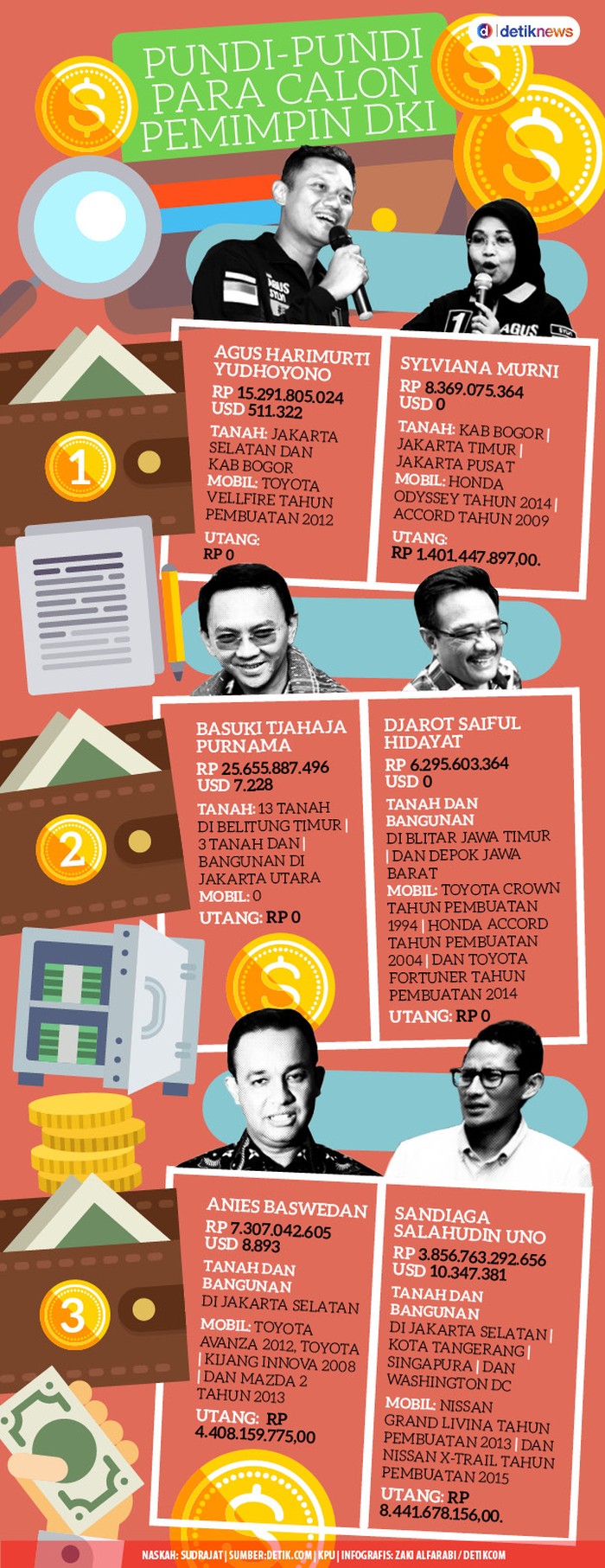 Jakarta - Komisi Pemilihan Umum (KPU) DKI mengumumkan kekayaan tiga pasangan calon di Pemilu Gubernur DKI 2017. Bila dilihat dari nominal rupiah yang mereka miliki, ternyata calon yang paling kaya di Pilgub DKI 2017 adalah cawagub Sandiaga Uno, disusul oleh cagub Basuki Tjahaja Purnama (Ahok), cagub Agus Harimurti Yudhoyono, cawagub Sylviana Murni, cagub Anies Baswedan, dan di urutan terbawah ada cawagub Djarot Saiful Hidayat.