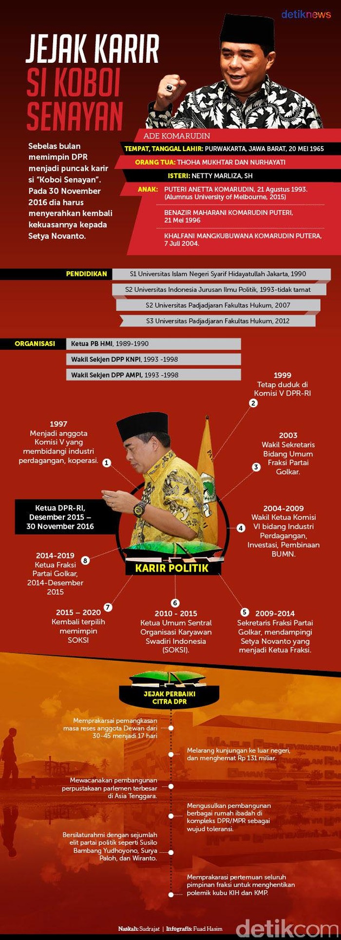 Jakarta - Keberanian Ade Komarudin menggalang Hak Angket kasus dana nonbujeter Bulog tahun 2001 membuat dia mendapat julukan si "Koboi Senayan'. Sebelas bulan memimpin DPR menjadi puncak kariernya, hingga pada 30 November 2016 dia harus menyerahkan kembali kekuasannya kepada Setya Novanto.