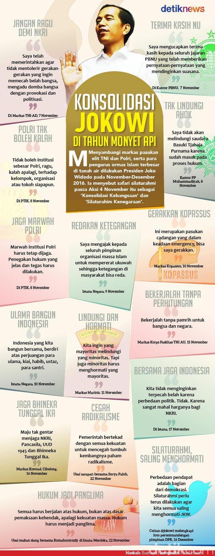 Jakarta - Menyambangi markas pasukan-pasukan elit TNI dan Polri, serta para pengurus ormas Islam terbesar di tanah air dilakukan Presiden Joko Widodo (Jokowi) secara berturut-turut pada November-Desember 2016. Ia menyebut safari silaturahmi pasca Aksi Bela Islam II pada 4 November itu sebagai 'Konsolidasi Kebangsaan' dan 'Silaturahim Kenegaraan'. Berikut ini pesan-pesan politik yang disampaikannya.