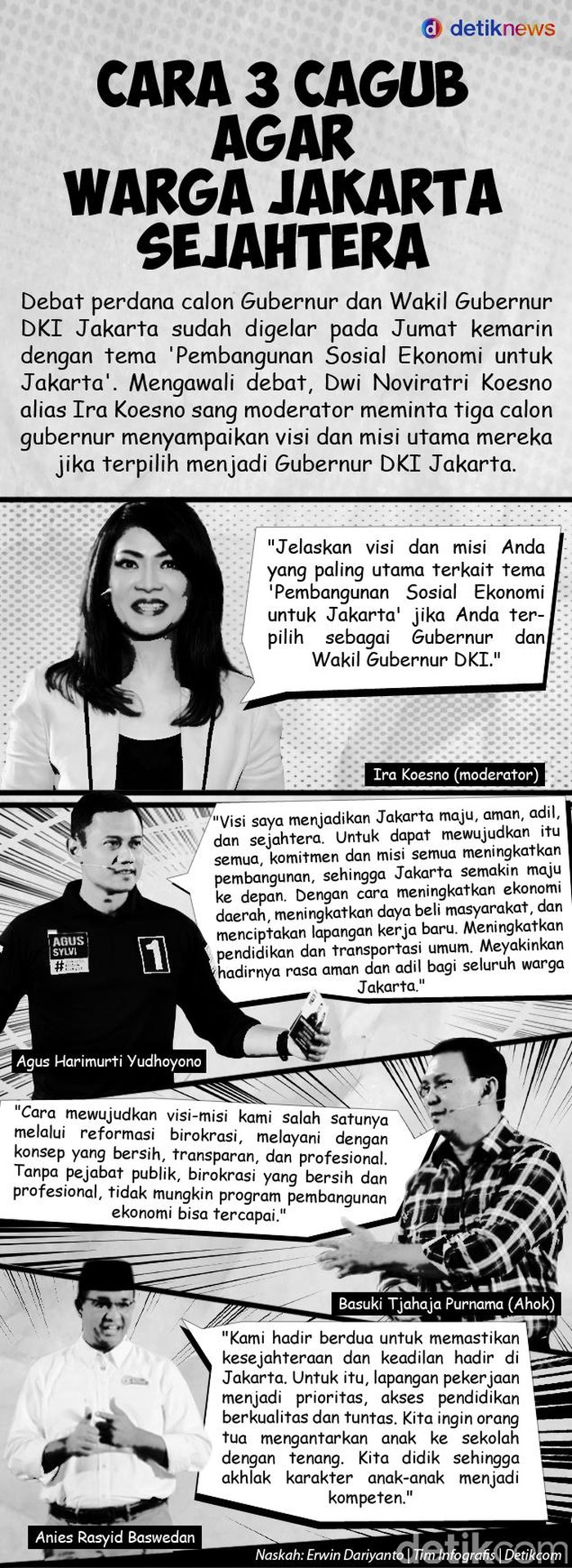 Jakarta - Debat perdana calon Gubernur dan Wakil Gubernur DKI Jakarta sudah digelar pada Jumat kemarin dengan tema 'Pembangunan Sosial Ekonomi untuk Jakarta'. Mengawali debat, Dwi Noviratri Koesno alias Ira Koesno sang moderator meminta tiga calon gubernur menyampaikan visi dan misi utama mereka jika terpilih menjadi Gubernur DKI Jakarta.