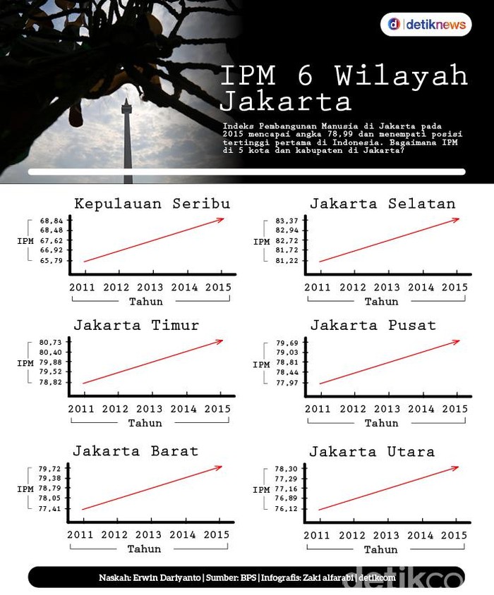 Jakarta - Indeks Pembangunan Manusia di Jakarta pada 2015 mencapai angka 78,99 dan menempati posisi tertinggi pertama di Indonesia. Bagaimana IPM di 5 kota dan kabupaten di Jakarta?