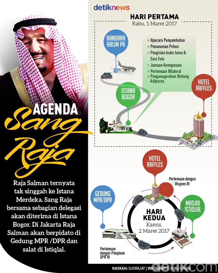 Jakarta - Raja Salman bersama sebagian delegasi akan diterima di Istana Bogor. Di Jakarta, Raja Salman akan berpidato di gedung MPR/DPR dan salah di Masjid Istiqlal.