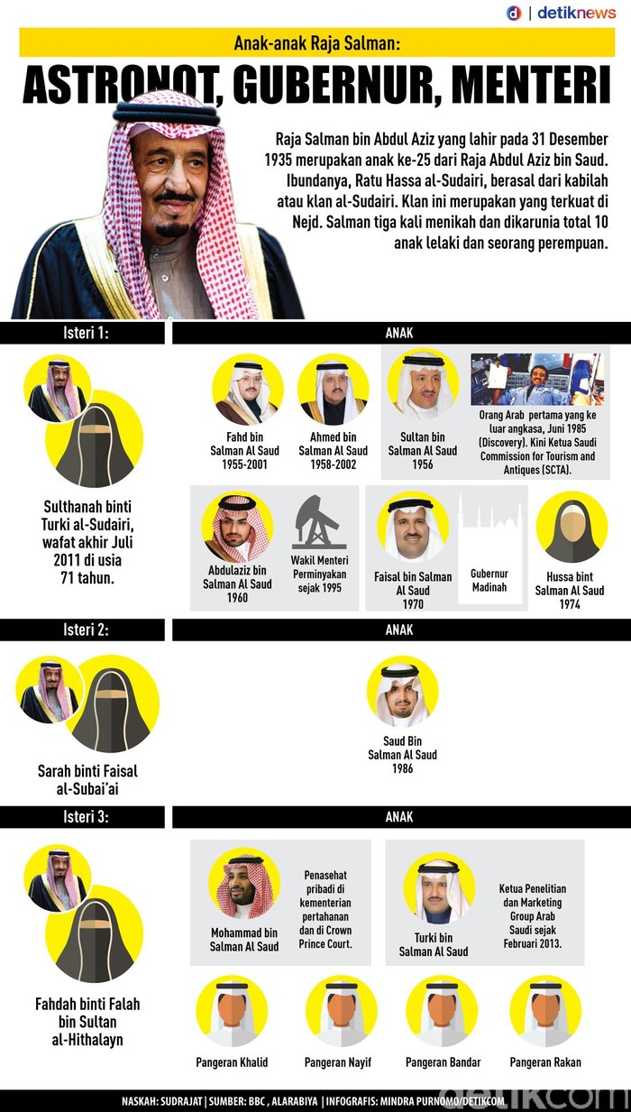 Jakarta - Raja Salman bin Abdul Aziz yang lahir pada 31 Desember 1935 merupakan anak ke-25 dari Raja Abdul Aziz bin Saud. Raja Salman 3 kali menikah dan dikaruniai total 10 putra dan seorang anak perempuan.