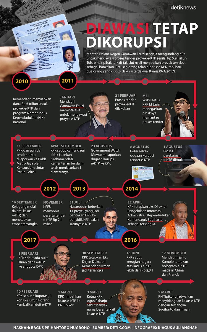 Menteri Dalam Negeri Gamawan Fauzi sengaja mengundang KPK untuk mengawasi proses tender proyek e-KTP senilai Rp 5,9 Triliun. Toh, pihak-pihak terkait tak ciut nyali menjadikan proyek tersebut sebagai bancakan. Ratusan orang telah diperiksa KPK, tapi baru dua orang yang duduk di kursi terdakwa, Kamis (9/3/2017).