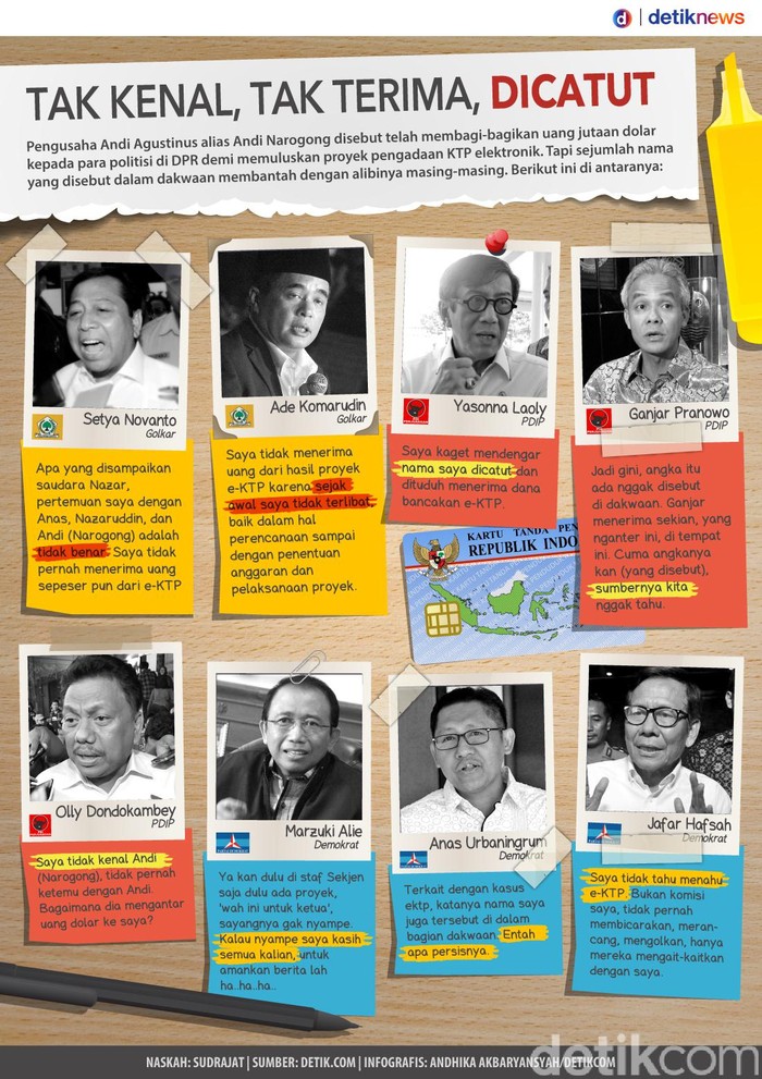 Jakarta - Pengusaha Andi Agustinus alias Andi Narogong disebut telah membagi-bagikan uang jutaan rupiah kepada para poltikus di DPR. Uang disetor untuk memuluskan proyek e-KTP. Sejumlah nama yang disebut dalam dakwaan membantah.