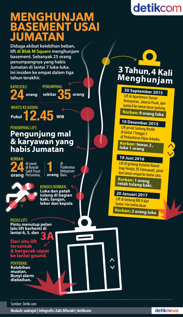 Jakarta - Diduga akibat kelebihan beban, lift di Blok M Square menghunjam basement. Sebanyak 25 orang penumpangnya yang habis Jumatan di lantai 7 luka-luka. Ini insiden ke empat dalam tiga tahun terakhir.