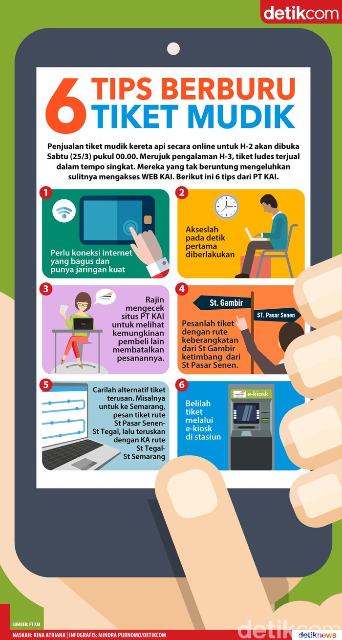 Jakarta - Penjualan mudik kereta api secara online untuk H-2 akan dibuka Sabtu (25/3/2017) pukul 00.00 WIB. Merujuk pengalaman H-3, tiket ludes terjual dalam tempo singkat. Mereka yang tak beruntung mengeluhkan sulitnya mengakses WEB KAI. Berikut ini 6 tips dari PT KAI.