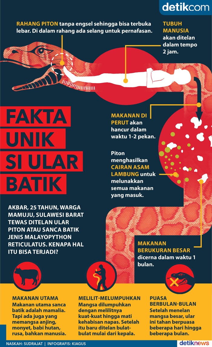Jakarta - Akbar,25 tahun, warga Mamuju, Sulawesi Barat tewas ditelan ular piton atau sanca batik jenis Malayopython Reticulatus. Kenapa hal itu bisa terjadi?