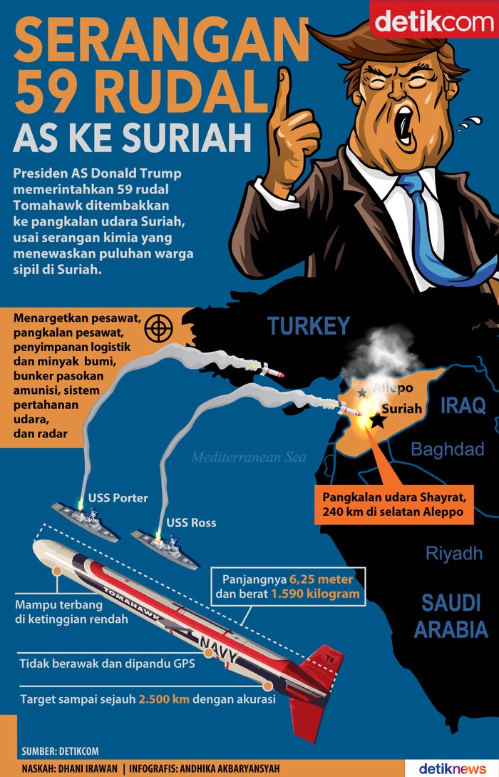 Jakarta - Presiden AS Donald Trump memerintahkan 59 rudal Tomahawk ditembakkan ke pangkalan udara Suriah, usai serangan kimia yang menewaskan puluhan warga sipil di Suriah.