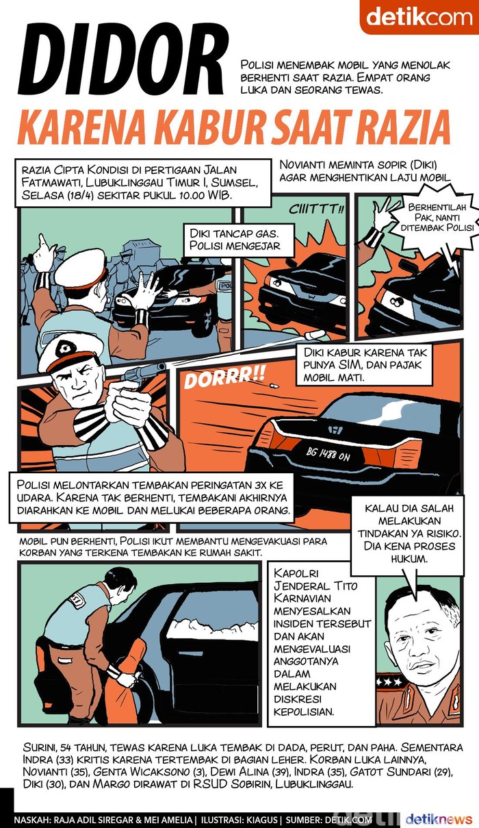 Jakarta - Sebuah mobil ditembak polisi setelah kabur dari razia yang dilakukan polisi di Lubuklinggau, Sumatera Selatan. Empat orang luka-luka dan satu orang meninggal dunia akibat aksi polisi itu.