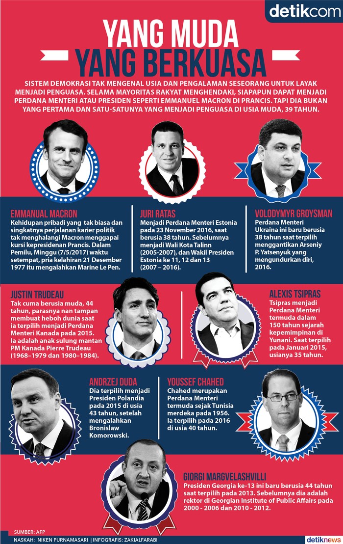 Jakarta - Sistem demokrasi tak mengenal usia dan pengalaman seseorang untuk layak menjadi penguasa. Selama mayoritas rakyat menghendaki, siapapun dapat menjadi perdana menteri atau presiden seperti Emmanuel Macron di Prancis. Tapi dia bukan yang pertama dan satu-satunya penguasa di usia muda, 39 tahun.