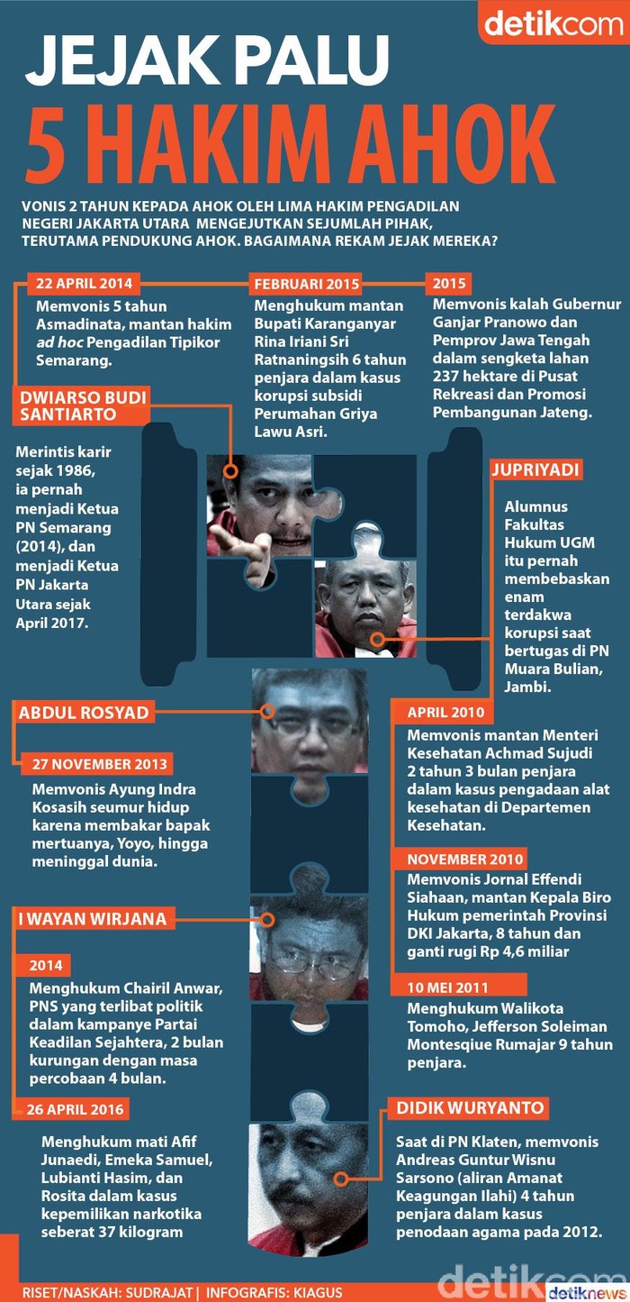 Jakarta - Vonis dua tahun majelis hakim Pengadilan Negeri Jakarta Utara terhadap Gubernur DKI Basuki Tjahaja Purnama (Ahok) lebih berat dari tuntutan jaksa. Seperti apa rekam jejak mereka selama menjadi hakim?