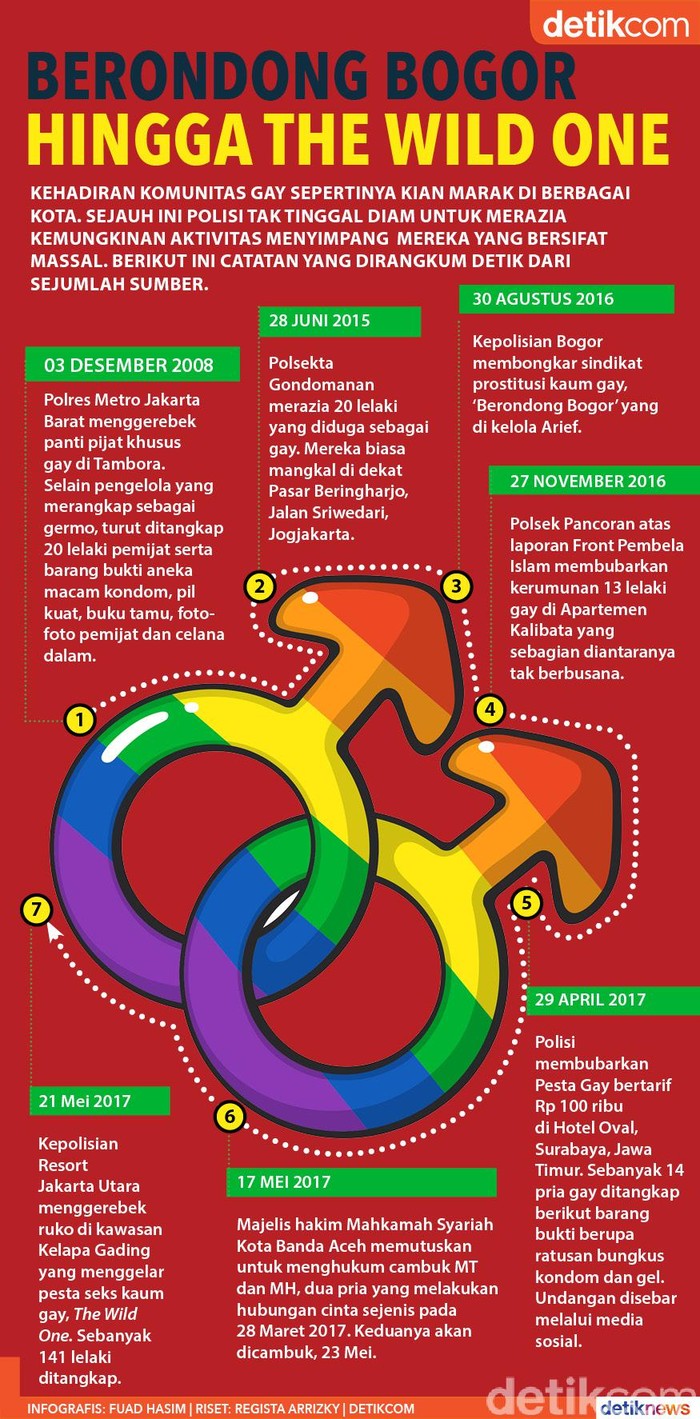 Jakarta - Polisi menindak dan merazia komunitas gay yang melakukan pesta seks di sejumlah daerah. Di Aceh dikenai hukuman cambuk.