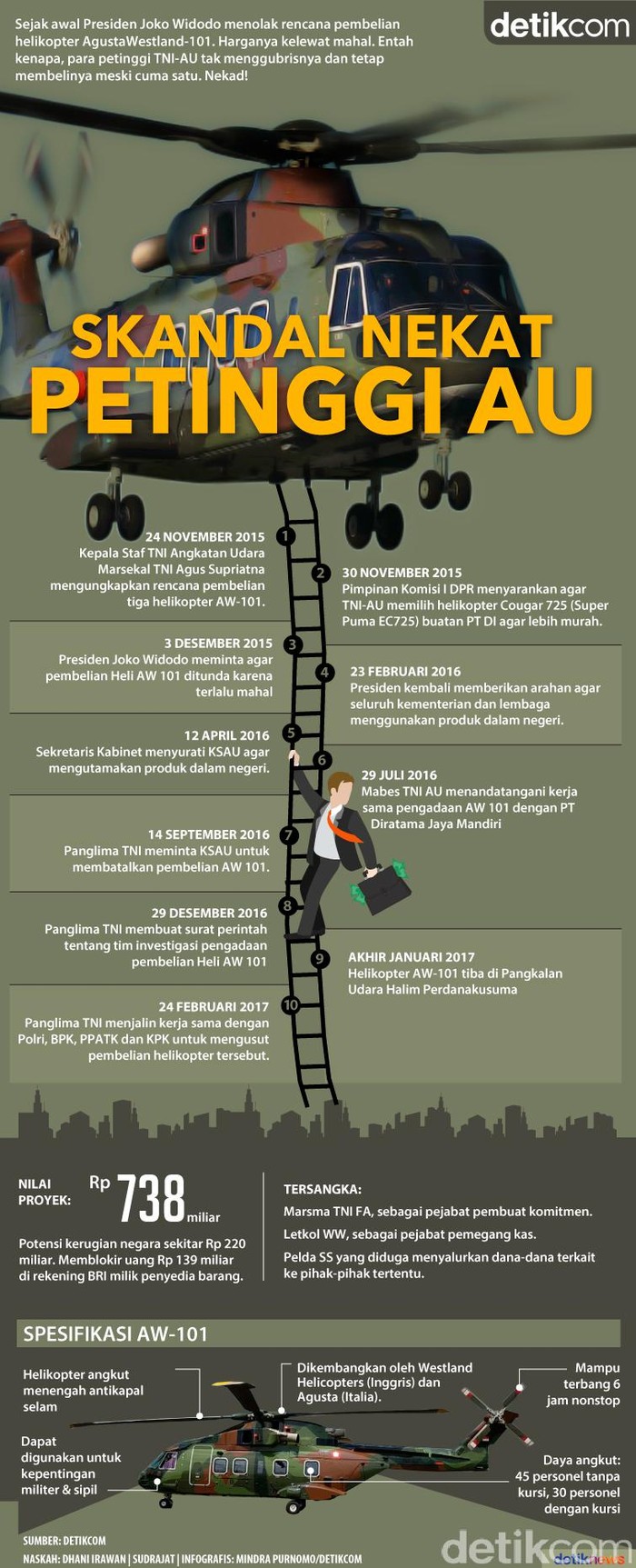Jakarta - Sejak awal Presiden Joko Widodo menolak rencana pembelian helikopter AgustaWestland-101. Harganya kelewat mahal. Entah kenapa, para petinggi TNI-AU tak menggubrisnya dan tetap membelinya meski cuma satu. Nekat!