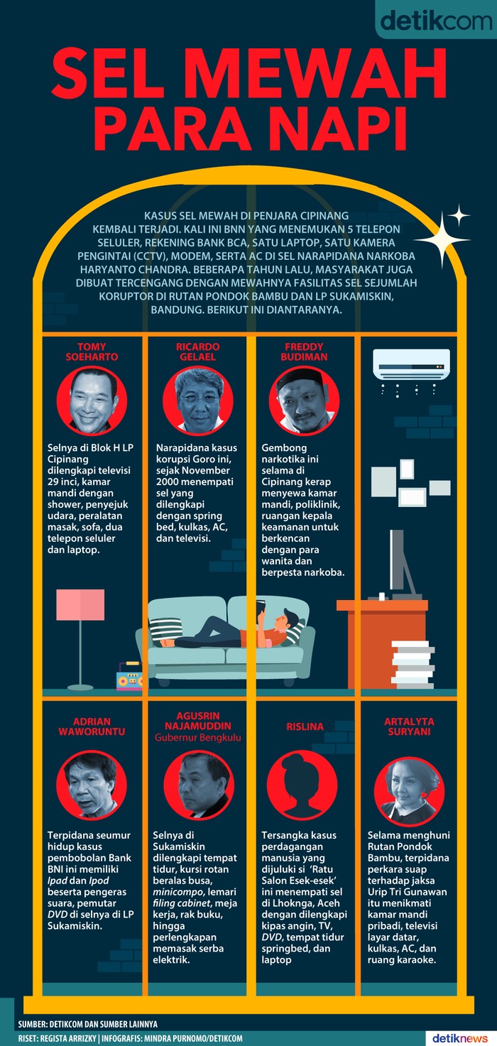 Sel Mewah Para Narapidana Sudrajat - detikNews Jumat, 16 Jun 2017 08:28 WIB Sel mewah para napi di berbagai penjara Jakarta - Uang dapat membeli segalanya. Begitulah yang diperlihatkan sejumlah narapidana yang menghuni berbagai penjara di tanah air. (jat/jat) Infografis Lainnya Infografis Pariwisata RI Catat Kinerja Solid di 2025, Devisa Capai US$ 13,82 Adhyaksa Awards 2025 Ini 6 Orang Sosok Jaksa Teladan Penerima Adhyaksa Awards 2025 Infografis Realisasi Prioritas Kemendikdasmen untuk Jaga Kualitas Pendidikan sel mewah