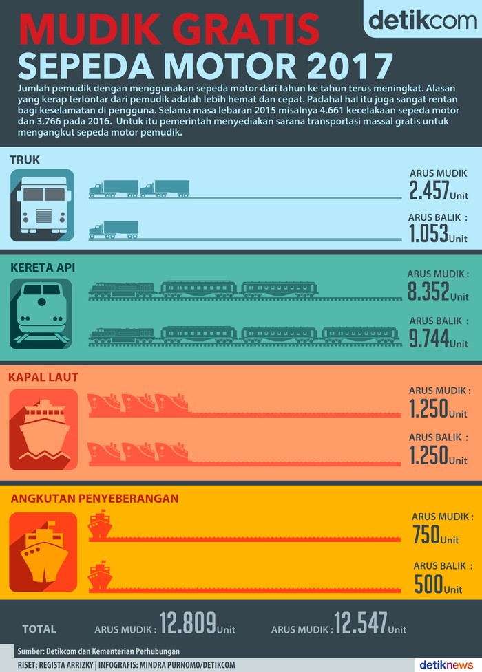Jakarta - Pemerintah menyediakan sarana transportasi massal gratis untuk mengangkut sepeda motor pemudik untuk mengurangi risiko kecelakaan.